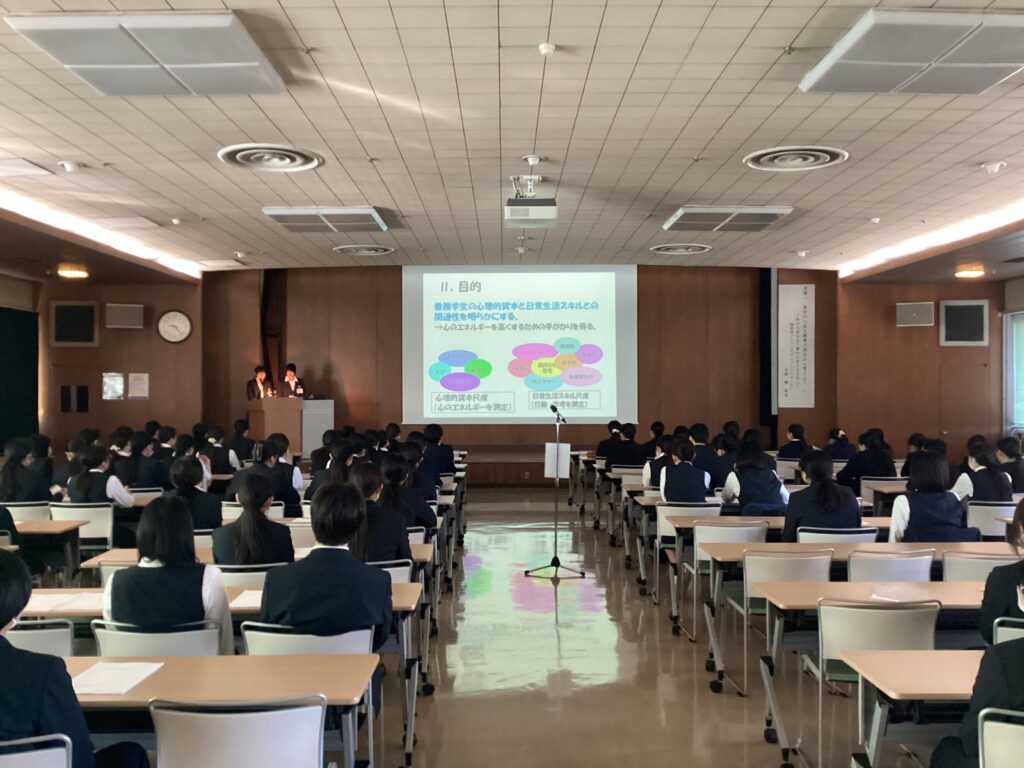 3学年合同で研究発表会を行い、各学年の代表が発表をしました。 活発な意見交換が行われ、互いの学びを深める有意義な時間となりました。 午後からは福岡プレコンセプションケアセンターの講師をお招きし、「自分の人生を健康の視点から考えよう」をテーマに貴重なお話を伺うことができました。