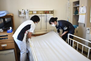 - 教員の指導のもと、患者さんが心地よく過ごせるよう、シーツのしわ一つひとつに気を配りました